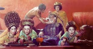 Seconda apparizione: Trimalchione spalmato di unguento tergebatur palliis ex lana mollissima factis. Poi sale sulla lettiga col seguito di eunuchi e schiavi: sulla lettiga c’è anche deliciae eius, puer vetulus, lippus domino Trimalchione deformior.