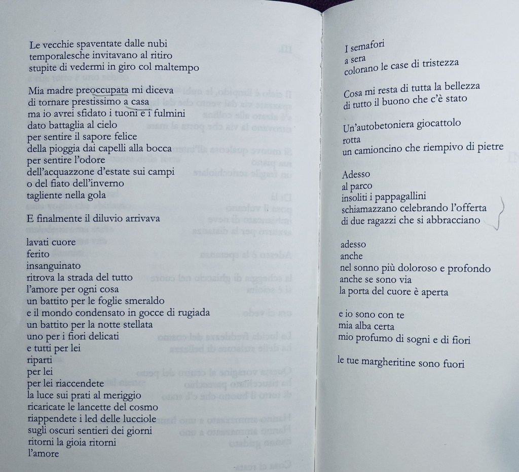 “il carattere aggressivo per le scosse / continue le eruzioni sputata dritta / dritta dal camino centrale un delta / rovesciato senza acqua o troppa? / fiore rosso e tutti pallidi assorti / nell’indifferenza di fronte al sonno / come si dispone il buio in cielo è / una imposizione di tenerezza“