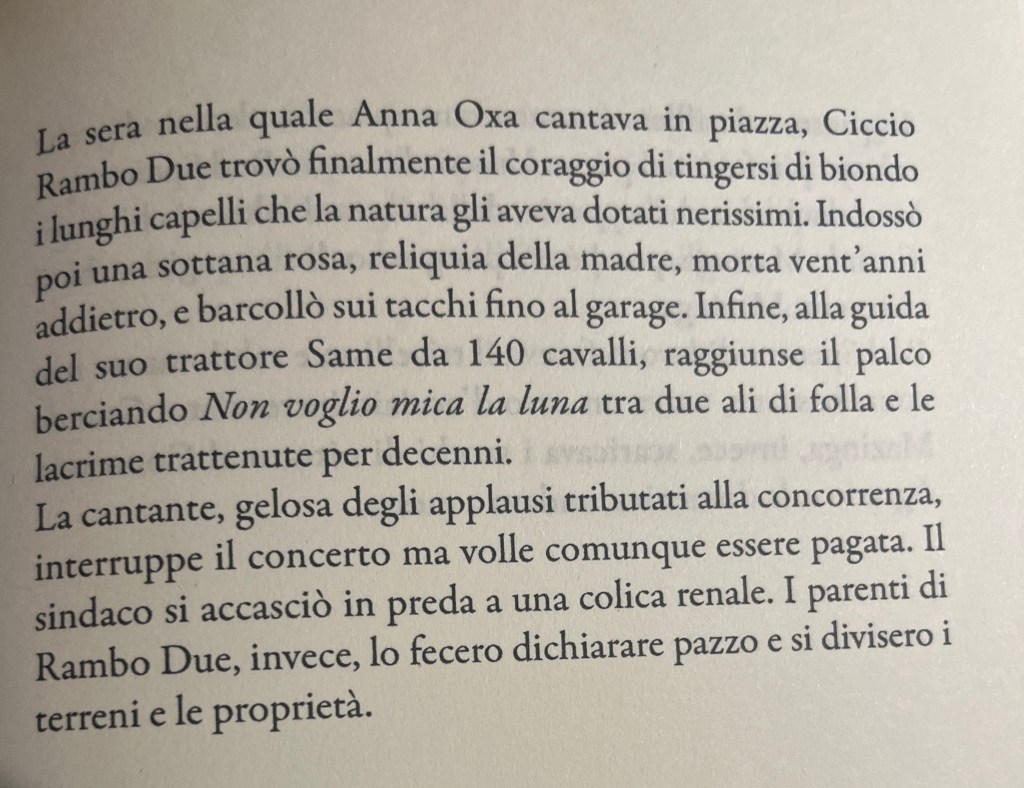 Il brano in foto tratto da Zagare e segreti di Enzo Cannizzo (Ensemble, 2024) ha un tono tragicomico e surreale. Ciccio Rambo Due è quasi una figura mitologica di provincia, tra il grottesco e il poetico. La scena è costruita con un crescendo teatrale. Ciccio Rambo Due trova finalmente il coraggio di farsi biondo, indossare la sottana della madre, i tacchi; si mette alla guida del suo trattore e raggiunge il palco in cui si esibisce Anna Oxa. Raggiunge il palco e strilla a squarciagola Non voglio mica la luna. Ciccio infine piange. Il gesto di Cicco è una performance pubblica ma anche un atto liberatorio che si scontra con la suscettibilità della cantante e gli interessi materiali della famiglia. Anna Oxa interrompe quindi il concerto, gelosa degli applausi, e pretende di essere ugualmente pagata. Il sindaco sconvolto è colpito da una colica renale. Ciccio Rambo trionfa e ci fa ridere. Ma il finale è amaro, ironico. Invece di essere riconosciuto per il suo momento di gloria, Ciccio viene dichiarato pazzo e i parenti si spartiscono i beni, riportando tutto a uno dimensione terrena e materiale.