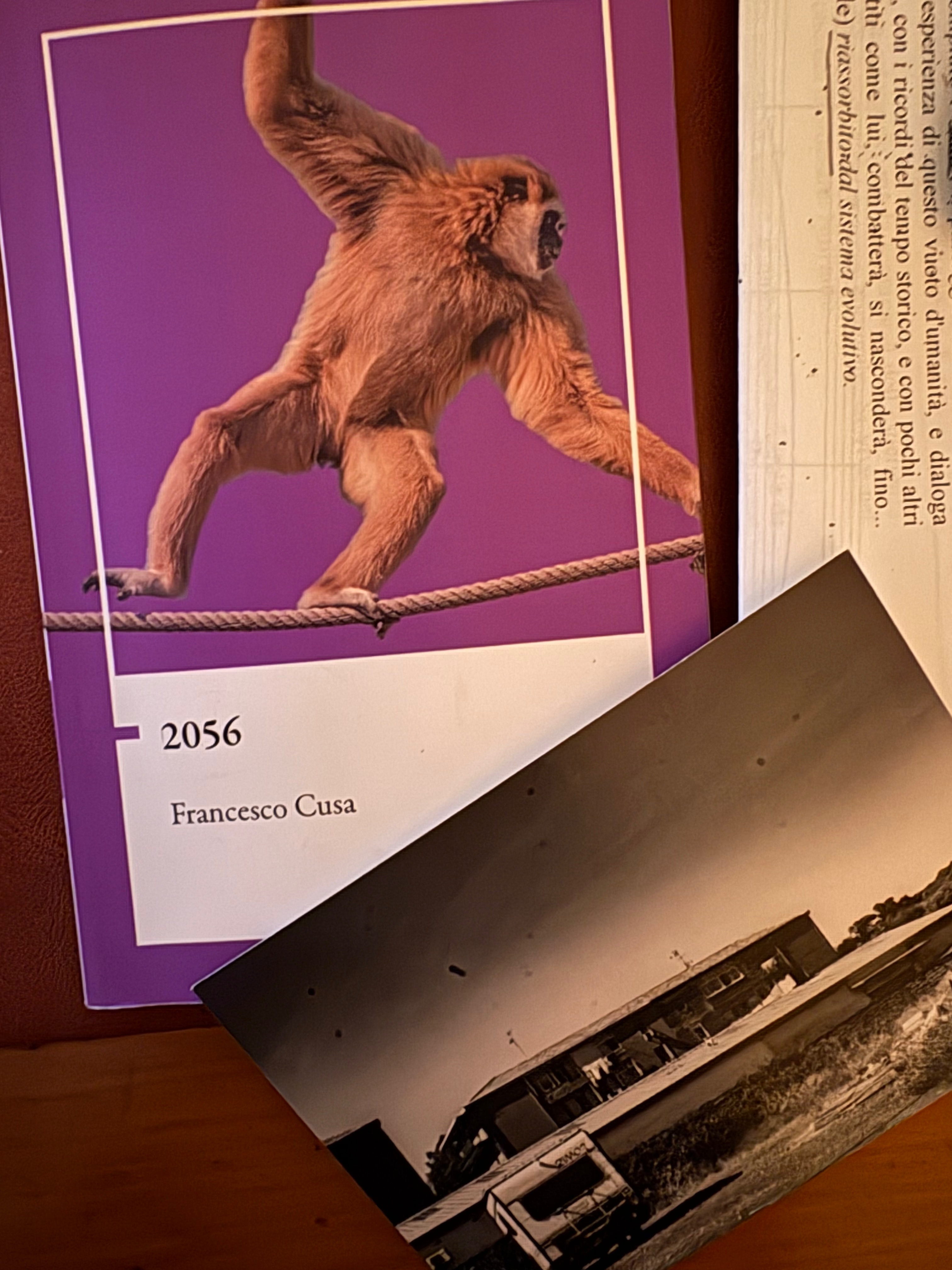 Per 2056, ho scelto una foto del 2023, nell’estate in cui il nostro vulcano, l’Etna, era più attivo del solito. Era un’estate accecata dal caldo e da continue piogge di cenere vulcanica. La foto ritrae un paesaggio urbano di periferia: una casa popolare, un capannone, un tetto; in primo piano una roulotte. Intorno, campagna rada, arbusti, la zona di confine tra l’urbanizzato e il lasciato andare. Ma metà immagine è cielo: un cielo pesante e grigio, non nuvoloso ma opaco, quel grigio da fine del mondo che grava su certe giornate estive in cui l’azzurro è velato da un’immensa coltre di nulla.
