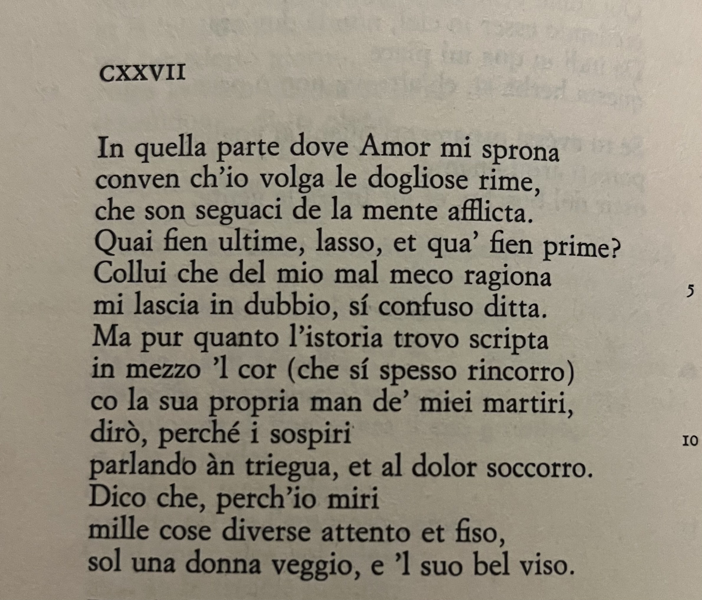 In foto, la prima stanza della canzone CXXVII di Francesco Petrarca. Qui si intrecciano, come in un indice, i grandi temi dell’esperienza amorosa: l’ossessione del pensiero, la ricostruzione del passato, la rimembranza, la scrittura come rimedio dell’anima. L’amore è battaglia, il mondo si inclina nella direzione del volto di Eros, e l’amata, nel suo bel viso, è sovrana del corpo e dello spirito dell’amante.”