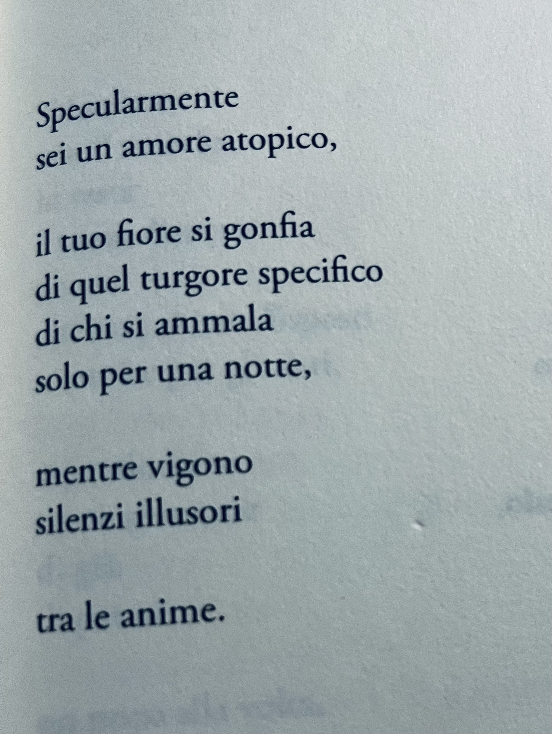 La lirica di Giulia d’Anca (da Camminamento, Carabba, 2025) si sviluppa attorno al tema della febbre d’amore. Amore atopico è un’espressione intrigante. Presuppone, per inverso, la possibilità di una definizione ben precisa di questo sentimento: una regola che governi Eros; oppure rimanda a una reazione incontrollata e fuori norma. Ma la reciprocità del sentimento, pur accettata, subisce una deformazione.
